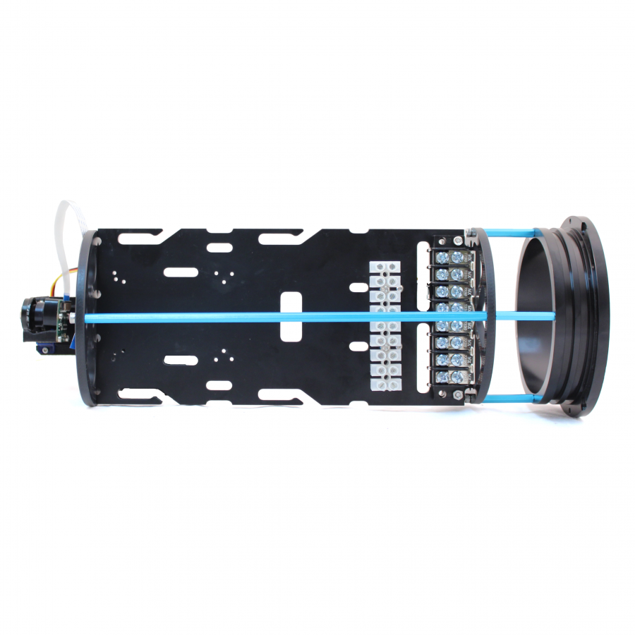 The Electronics Tray also includes slots for routing wires from one side of the board to the other and for cable ties to keep your wiring organized. The tray optionally comes with four terminal blocks that make it easy to connect power and motor wires. These are used on the BlueROV2 and might be useful for your project as well!