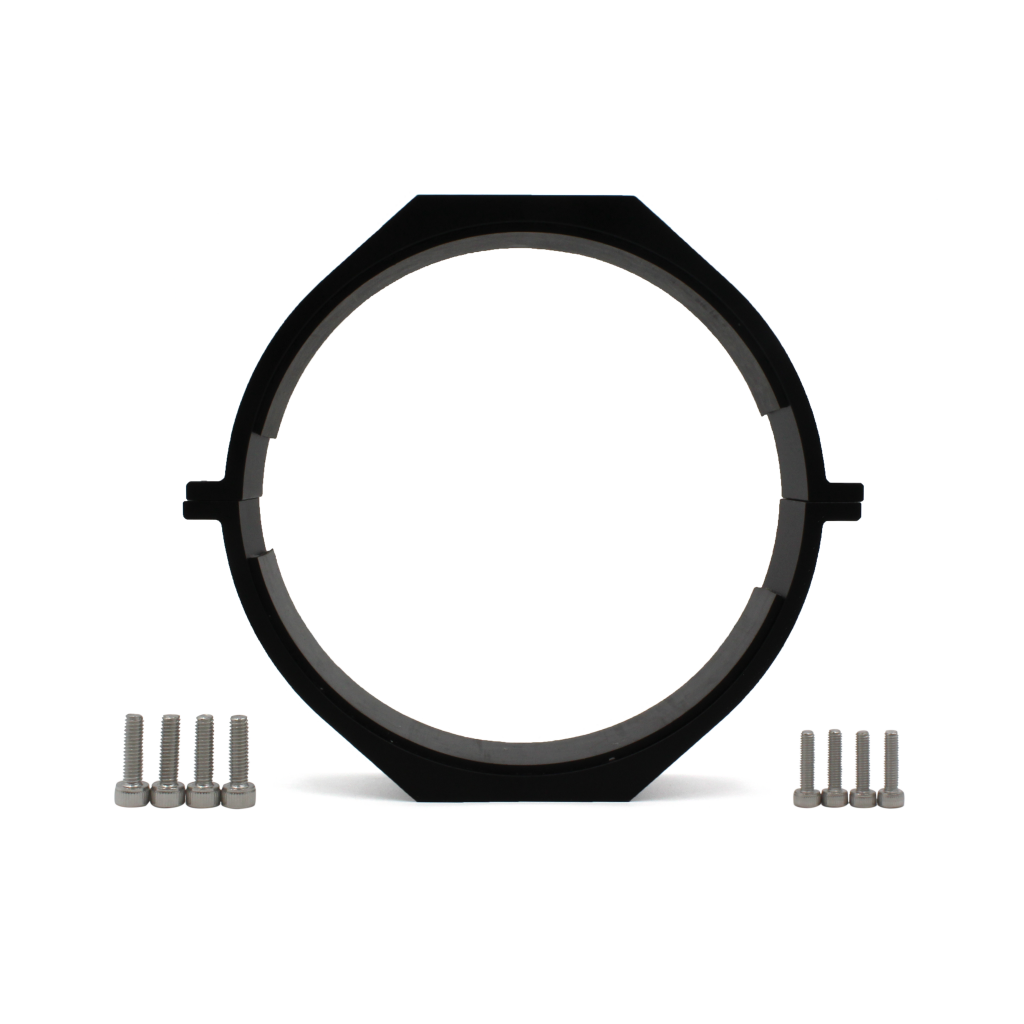 The Enclosure Clamp (4″ Series) clamps around a 4″ Watertight Enclosure, providing a simple and easy mounting solution. The eight threaded M4 mounting holes allow the watertight enclosure to be mounted flush to the structure of your vehicle, or on a Payload Skid for your BlueROV2.