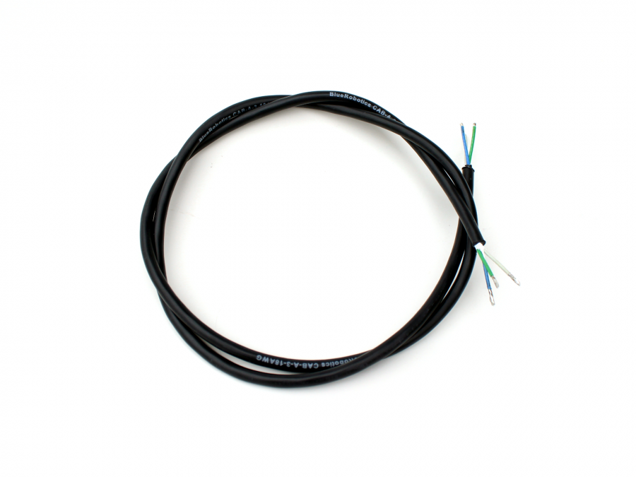 This 3-conductor cable is used on the T100 and T200 Thruster. You can splice it to the cable on your thruster to increase the length or you can use it to power other devices underwater. The cable is custom made with a pressure-extruded polyurethane jacket, Teflon tape, and flexible 18 AWG conductors. It’s really tough and abrasion resistant. The conductors insulation is chemically etched to ensure excellent adhesion to potting compounds and glues.